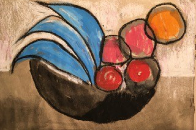 Fruitschaal, krijt, oostindische inkt op papier, 29,5 x 21 cm